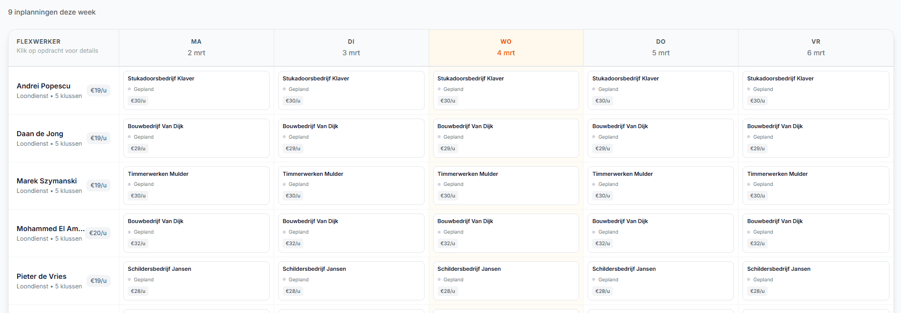 Overzichtelijke weekplanning met directe inzage in bezetting, beschikbaarheid en marges.